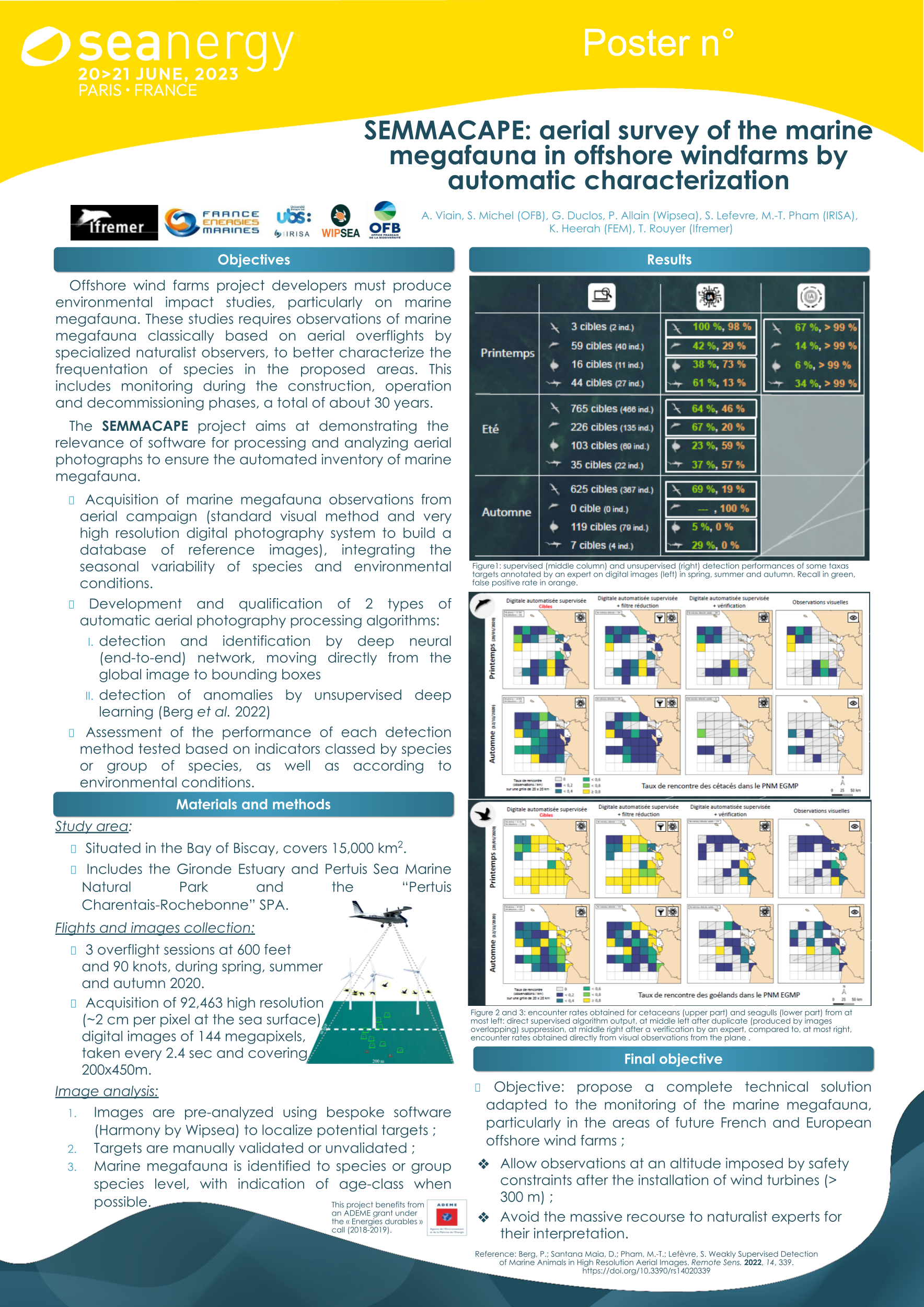 Problème : comparer les détections obtenues par les systèmes automatiques basés sur des photographies aériennes haute résolution avec les observations effectuées par des observateurs embarqués dans le même avion que la caméra. Caractériser automatiquement les espèces de mégafaune marine susceptibles d'être présentes sur les futurs parcs éoliens en France.